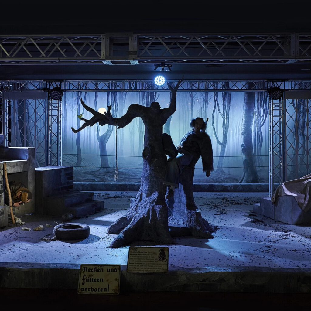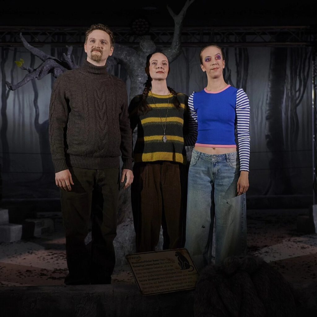 Die sensible Inszenierung von Stephan Rumphorst lässt die drei Tier-Darsteller mit ihrem nur halb verstehenden Blick auf das Lager der „Gestiefelten“ und der „Gestreiften“ die ganze Ratlosigkeit, Angst und Verdrängung ausdrücken, bis hin zu einer schmerzhaften, von einem Trommel-Exzess überdröhnten Panik-Attacke des Affen. Cosima Büsing, von Emine Güner mit rosa Wimpern und Gesäßtaschen behutsam als Pavian gekennzeichnet, spielt sich die Seele aus dem Leib, charakterisiert von schmeichelnder Kantilene bis zum schrillen Schrei die Seelenlagen ihrer Tierfigur.