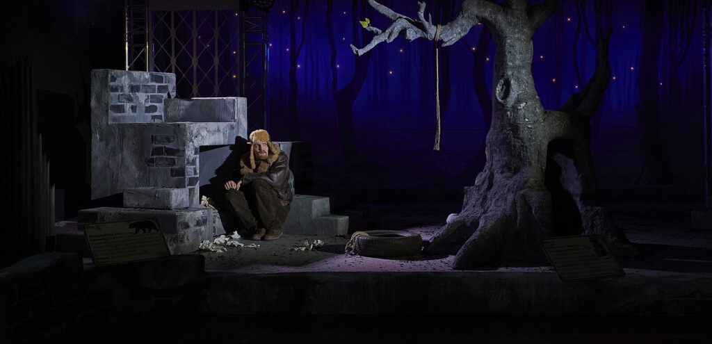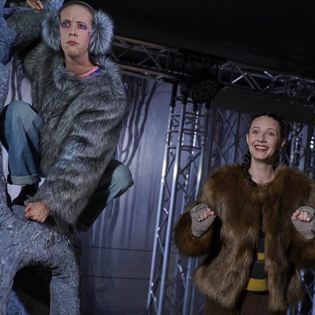 Wendy Krikken reckt und streckt sich nach dem Winterschlaf in wohliger Ignoranz, auch wenn dem Murmeltier klar ist, dass „das Nashorn etwas gesehen hat“. Immerhin: Es nimmt sich vor, den gestorbenen Kumpel nie zu vergessen. Am Ende wird in einer Szene, die für Jens Raschke der Ausgangspunkt seines Stücks war, in einem poetischen Bild die Wahrheit über den Tod des Nashorns offenbart – in einer Schilderung, deren träumerische Magie über den Fabel-Realismus der Geschichte hinausreicht. Da ist der Bär (Franz Schilling, deutlich artikulierend und mit der Stimme gestaltend) schon mit jungenhaftem Elan aus seiner „Bärenburg“ ausgebrochen und Opfer seines Wissen-Wollens geworden.